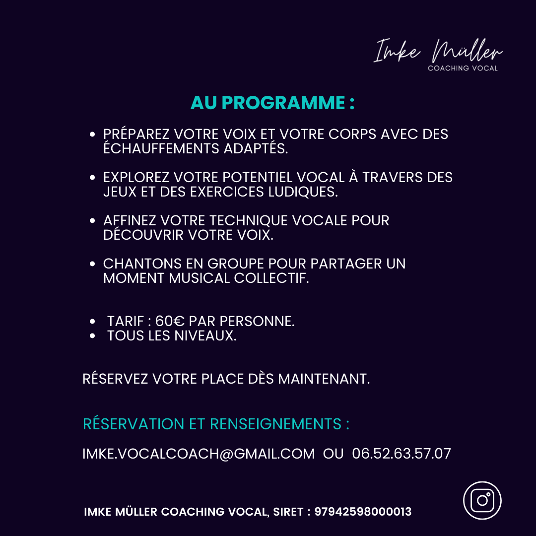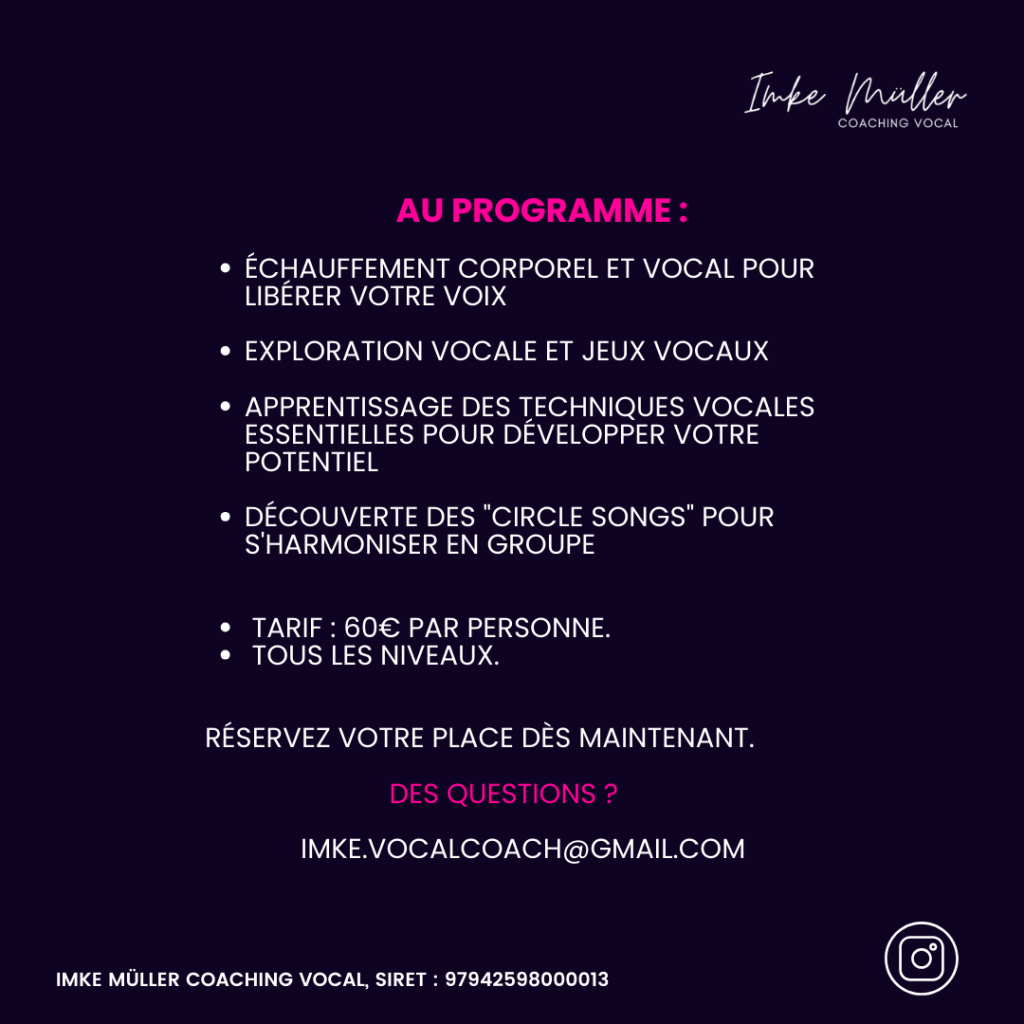 L’objectif est que tu puisses reproduire les techniques que nous allons apprendre ensemble chez toi et devenir autonome dans ta pratique. Ensemble, nous allons faire vibrer ta voix et te donner les outils pour briller !