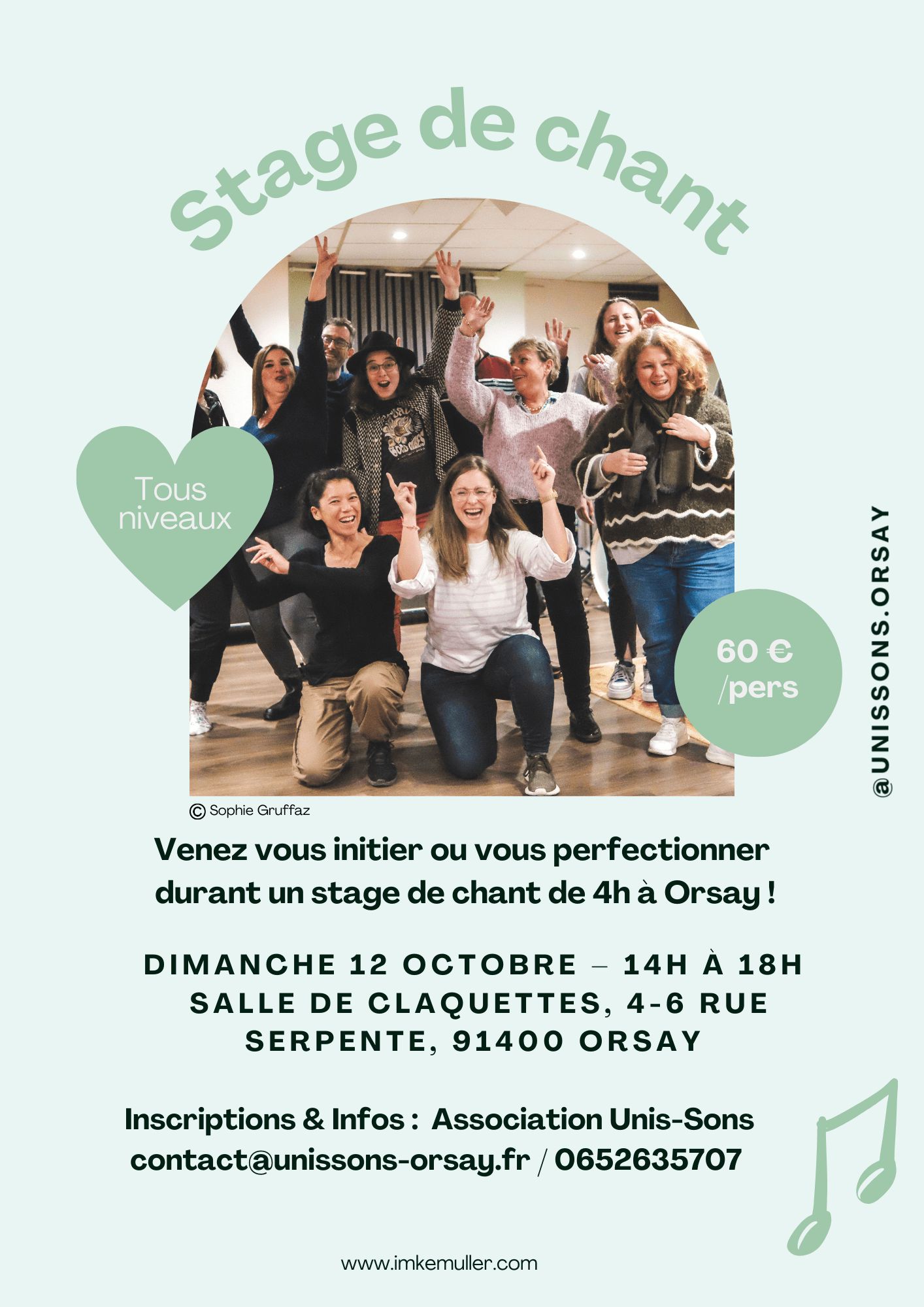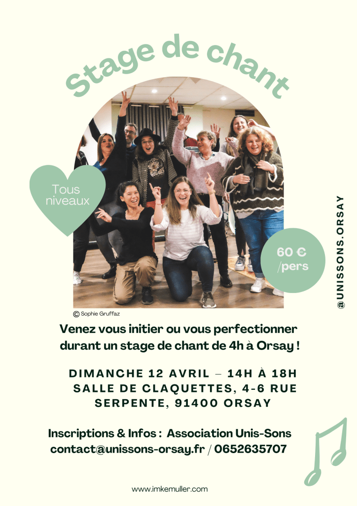 Découvrez mes cours de chant à Orsay ou en ligne, ainsi que mes stages pour progresser et explorer votre voix.