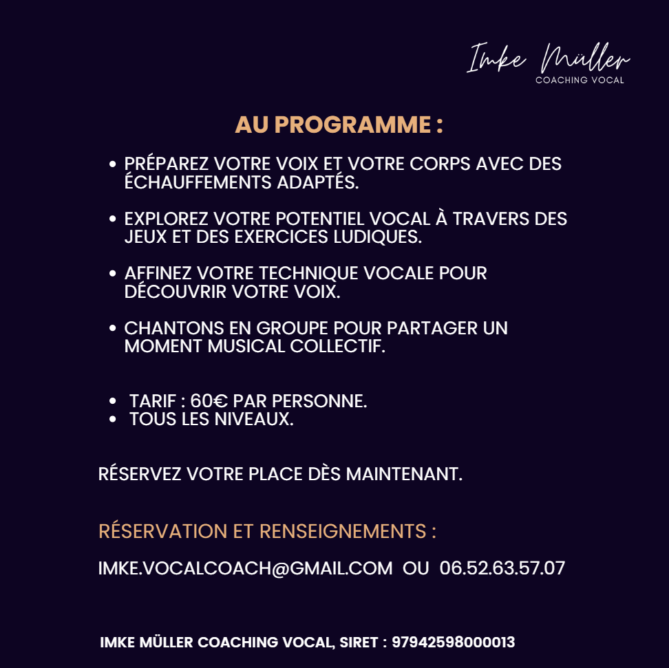 Je suis Imke Müller et je suis ravie de vous accueillir ici ! La voix est un outil puissant, et je suis là pour vous aider à l’explorer, à la découvrir et à la faire briller. Mon approche personnalisée et bienveillante vous permettra de vous sentir à l’aise et prêt à vous envoler.
